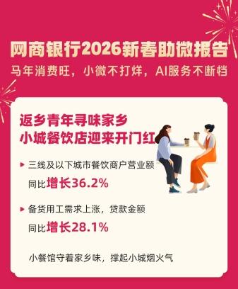 2月24日,网商银行发布2026年新春助微报告。报告显示,马年春节呈现“居民消费热、小微经济活、金融服务不断档”的新气象:返乡经济、冰雪旅游、宠物经济等新消费多点开花,三线及以下城市小微经济活力凸显。与此同时,网商银行通过AI技术精准识别小微经营者开工情况,春节期间金融服务“不打烊”,为他们提供免息资金支持,其中七成流向三线及以下城市和县域,让小店开工更有底气。