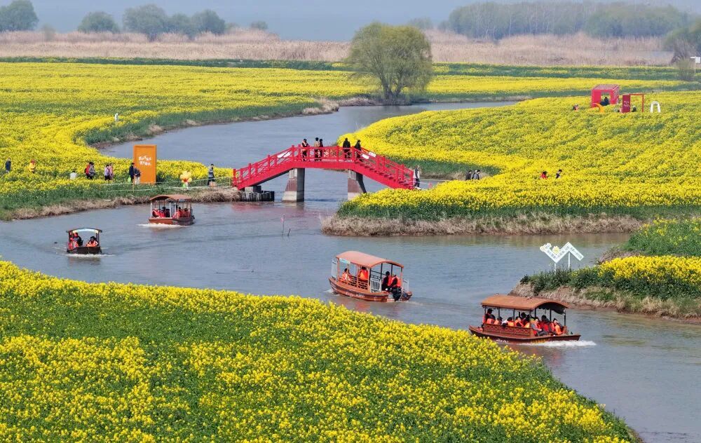 3月14日,游客在江苏省高邮市湖上花海景区乘船赏花。新华社发(孟德龙摄)